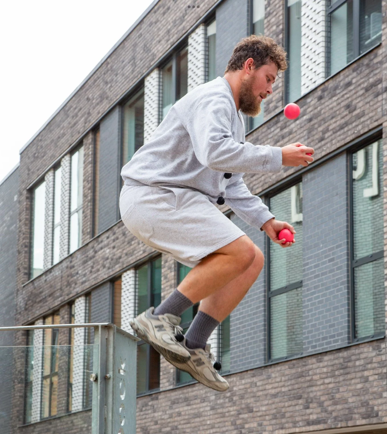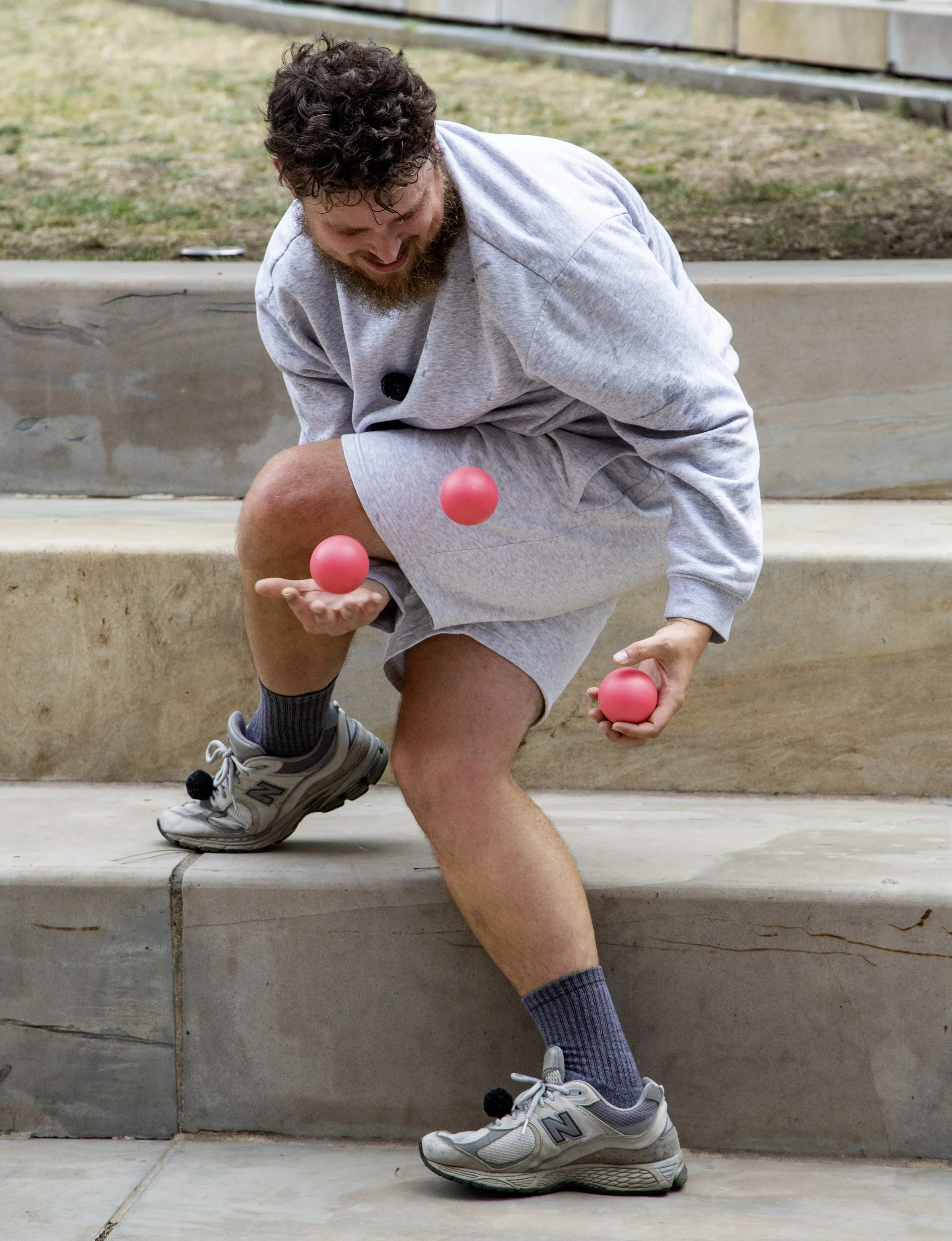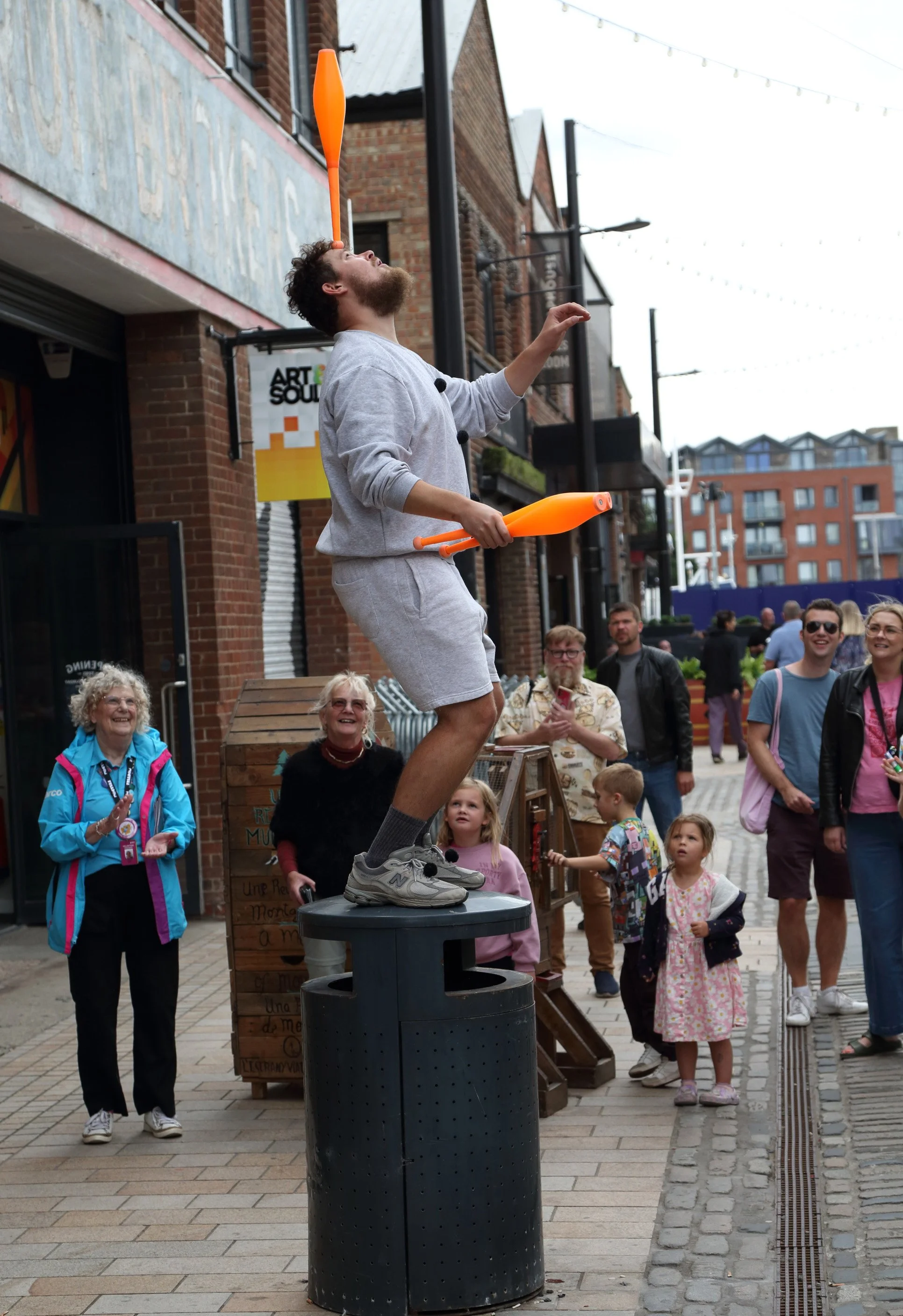 Grey Area is a street performance by Charles Brockbank, blending juggling, parkour, and clowning to reimagine the overlooked ‘grey zones’ of the urban landscape. This is a playful yet thoughtful response to the spaces we often move through without noticing. Created through a neurodivergent lens, Grey Area invites audiences to reconsider their relationship with the built environment — to pause, look again, and find moments of connection in the in-between.